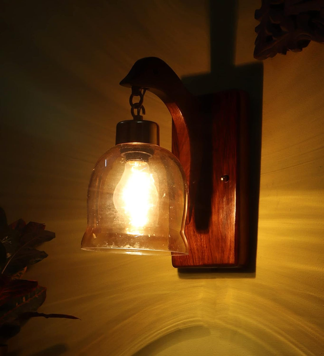 Luxiono Lighting Wood Wall Lamp with Unique Fish Design/Gold Plated Metal Cap, Brass Hook along with Luster Bell Glass with E27 Bulb Holder(Bulb not Included) for Bedroom, Living Room, Hallway or any Space of Your Choice
