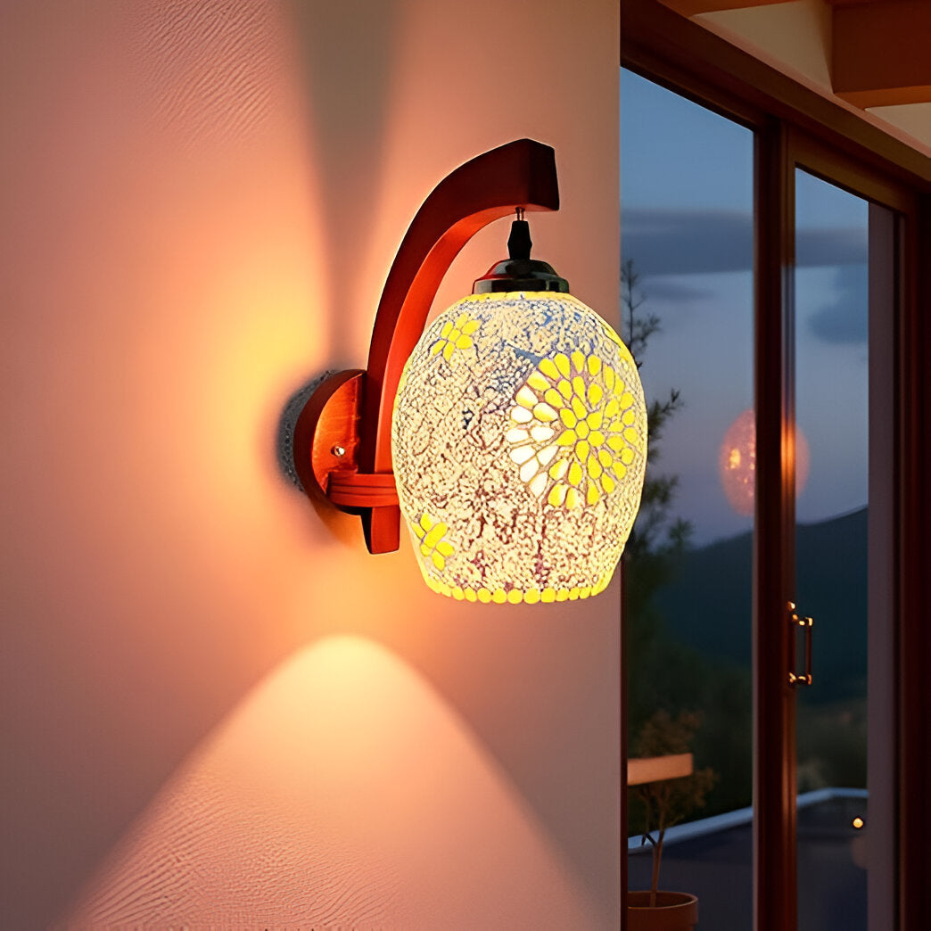 Luxiono Lighting Wood Wall Light/E 27 Bulb Holder/Gold Plated Metal Cap/Brass Rivets/Floral Designer Glass/Antique/Home/Office Decor